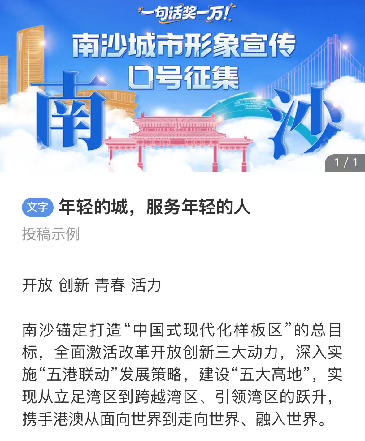 为展示走向世界的南沙,激发奋进力量,塑造独特鲜明的城市形象,即日起至2025年12月10日,南沙面向社会公开征集城市形象宣传口号,用一句话向世界推介南沙。无论您身在何处,只要关心南沙、热爱南沙,邀请您为南沙提炼出打动人心的宣传口号。